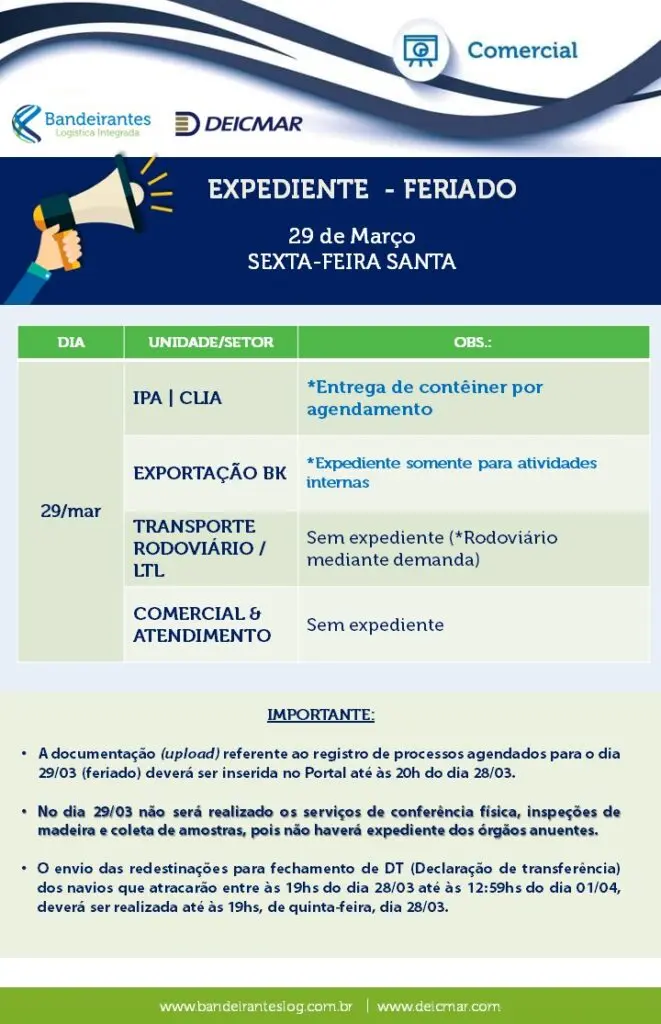 A Bandeirantes Deicmar Logística Integrada utiliza cookies e outras tecnologias semelhantes para melhorar a sua experiência, de acordo com o nosso aviso de Privacidade de Dados e, ao continuar navegando, você concorda com estas condições. Aviso de Privacidade de Dados.