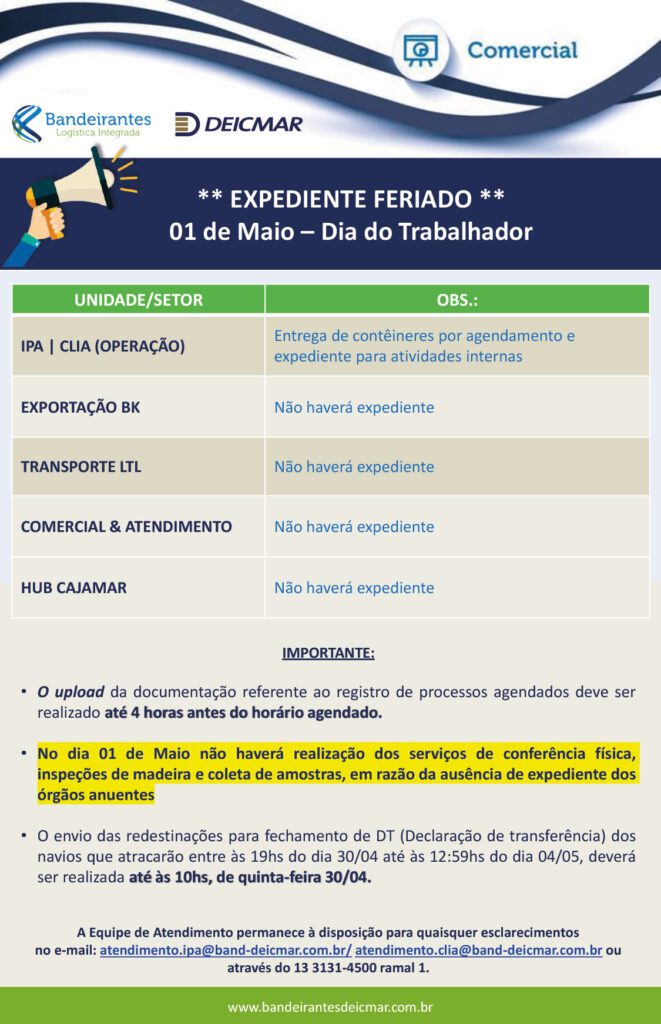 A Bandeirantes Deicmar Logística Integrada utiliza cookies e outras tecnologias semelhantes para melhorar a sua experiência, de acordo com o nosso aviso de Privacidade de Dados e, ao continuar navegando, você concorda com estas condições. Aviso de Privacidade de Dados.